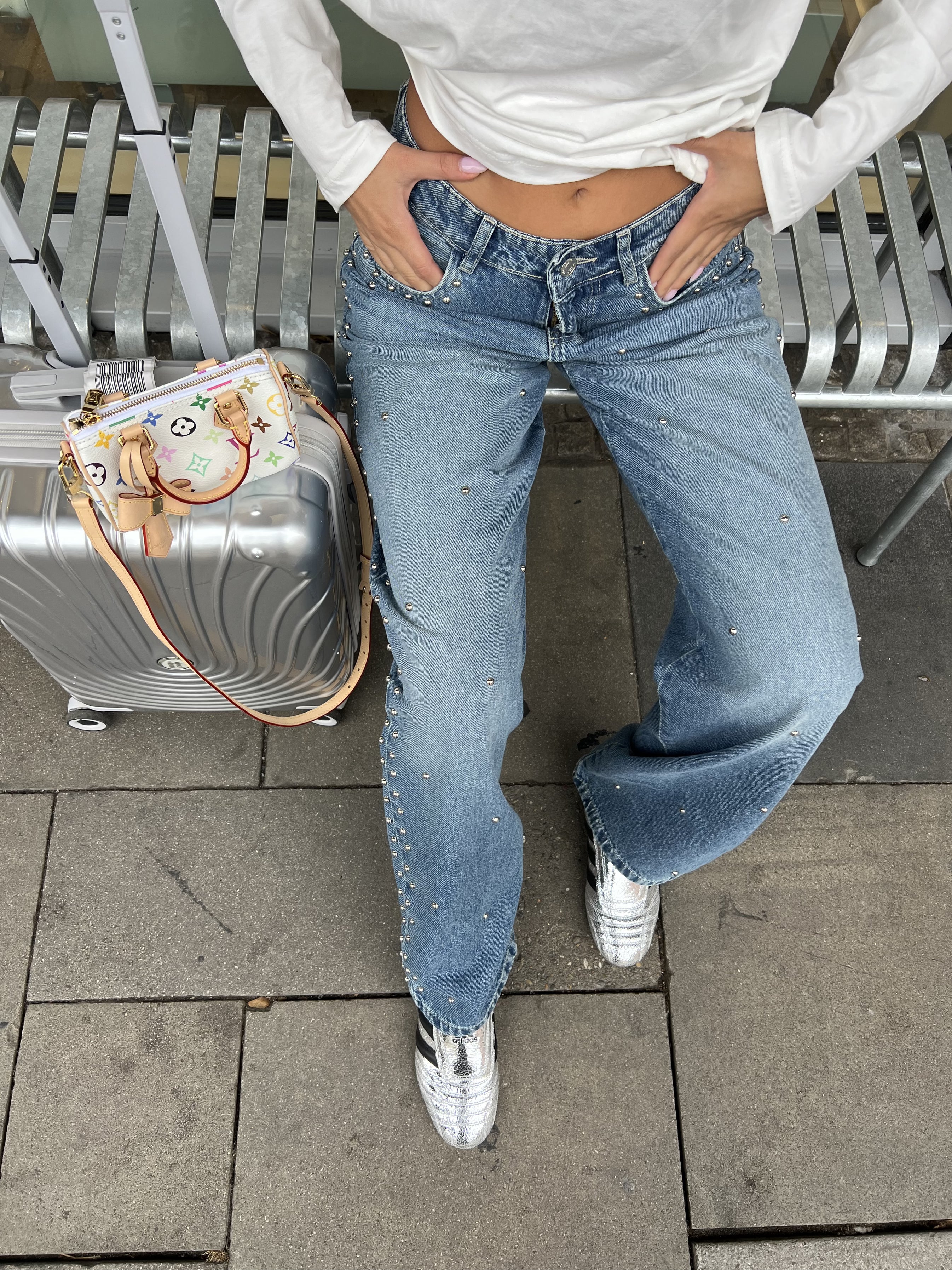Mid-rise wide-leg denim pants featuring scattered studs across the front.