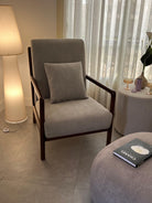 this lounge chair features a dark solid wood frame with smooth, curved armrests that hold a velvet cushion in a neutral grey tone. a perfect statement piece for cozy corners