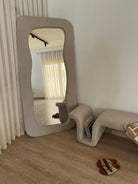 the Velvet Curved Mirror is a contemporary full-length piece featuring a soft, light grey, velvet frame. Its organic silhouette adds a touch of modern sophistication and gentle curves to any room, making it both a functional mirror and an understated design statement. It can be hung on the wall or used as a floor piece.