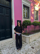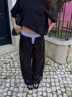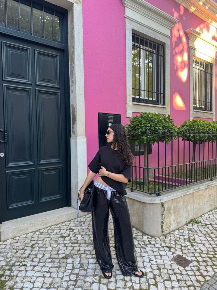 Relaxed-fit sequin pants in black with a colorful chequered, boxer lining. Elastic waist for all-day comfort, dressed up or down your way. Female Model is wearing size XS/S