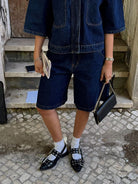 Mid waist, baggy fitted jorts that end right under the knee. Can be paired with our matching dark denim shirt for a set. Female model is wearing size 32