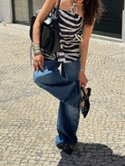 Mid waisted, wide leg denim pants with round silver studs on both sides. Female model is wearing size 32