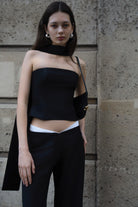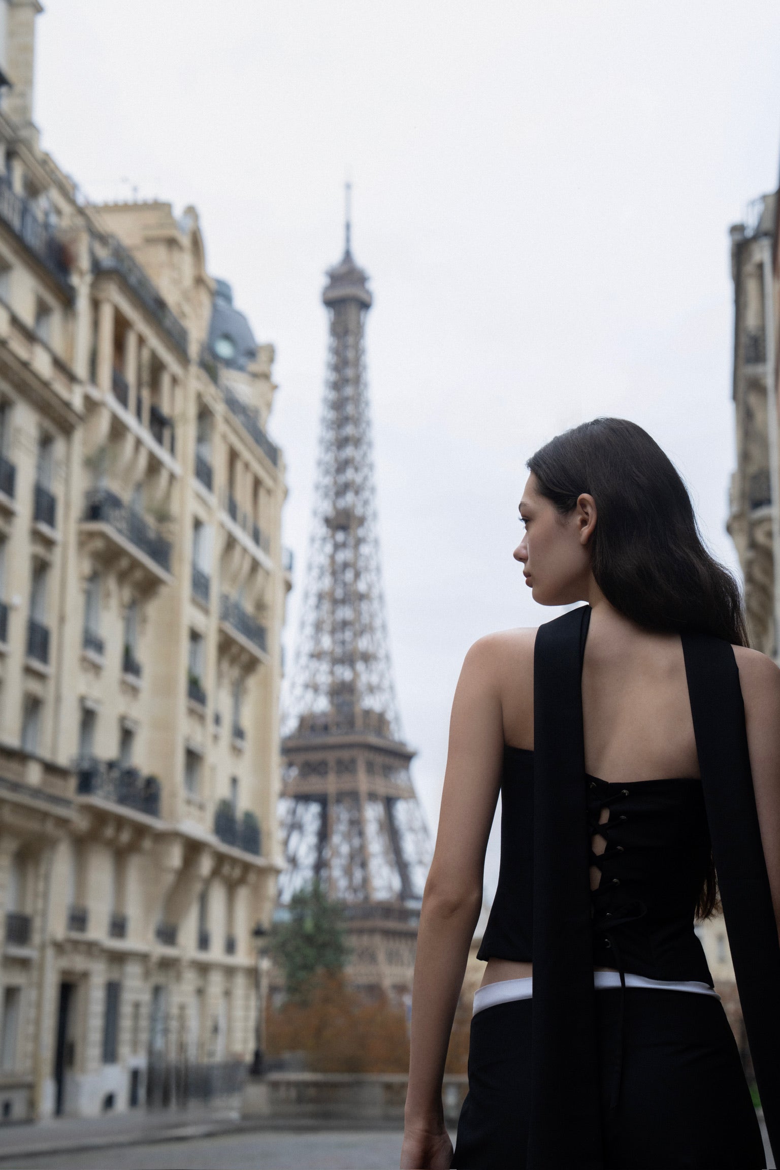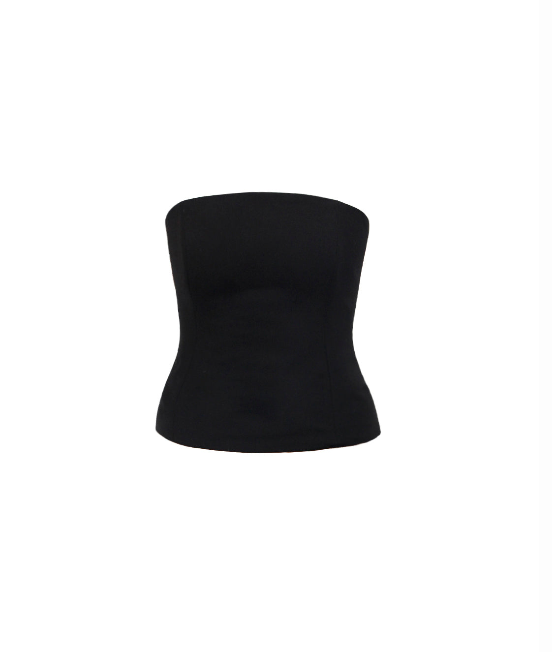corset with adjustable lace-up detailing at the back, designed to sculpt the silhouette and offer a customizable fit. Pair with matching tailored pants for set.