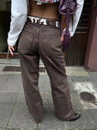 High-rise wide-leg denim pants in washed brown, featuring stitched detailing above and below the knees.