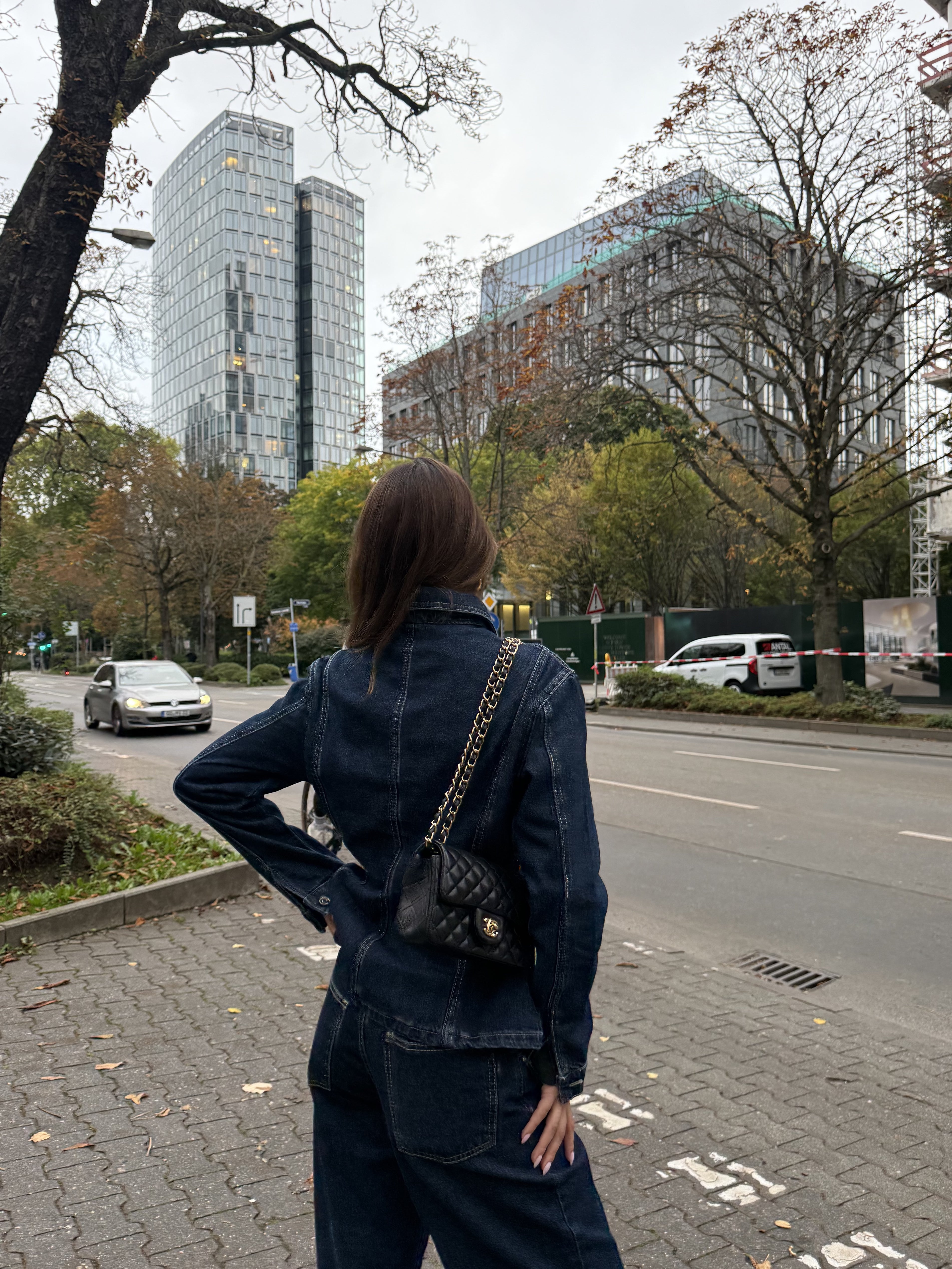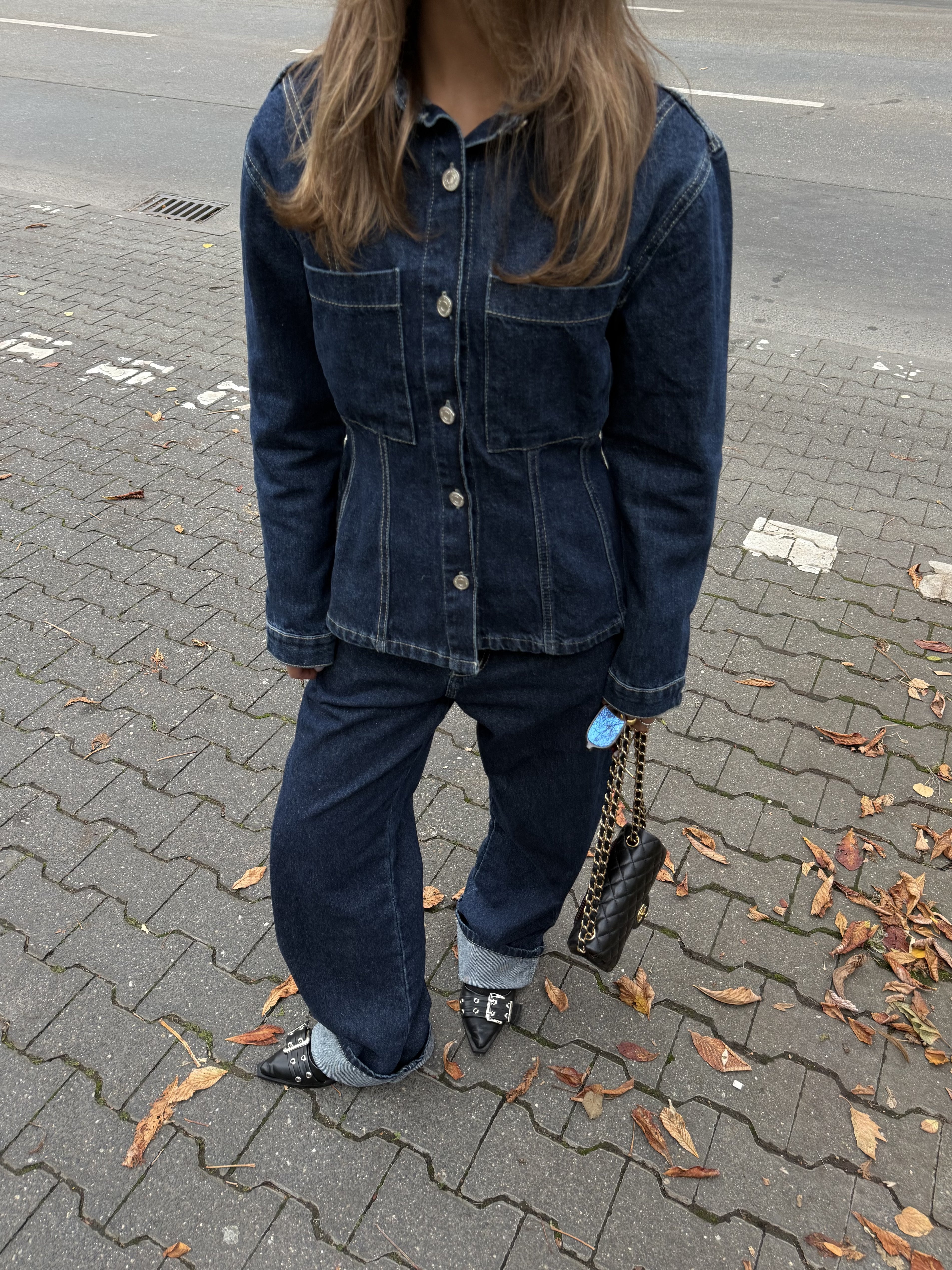 Dark fitted denim jacket with wide sleeves, designed to pair with our matching dark denim pants for a complete set.