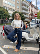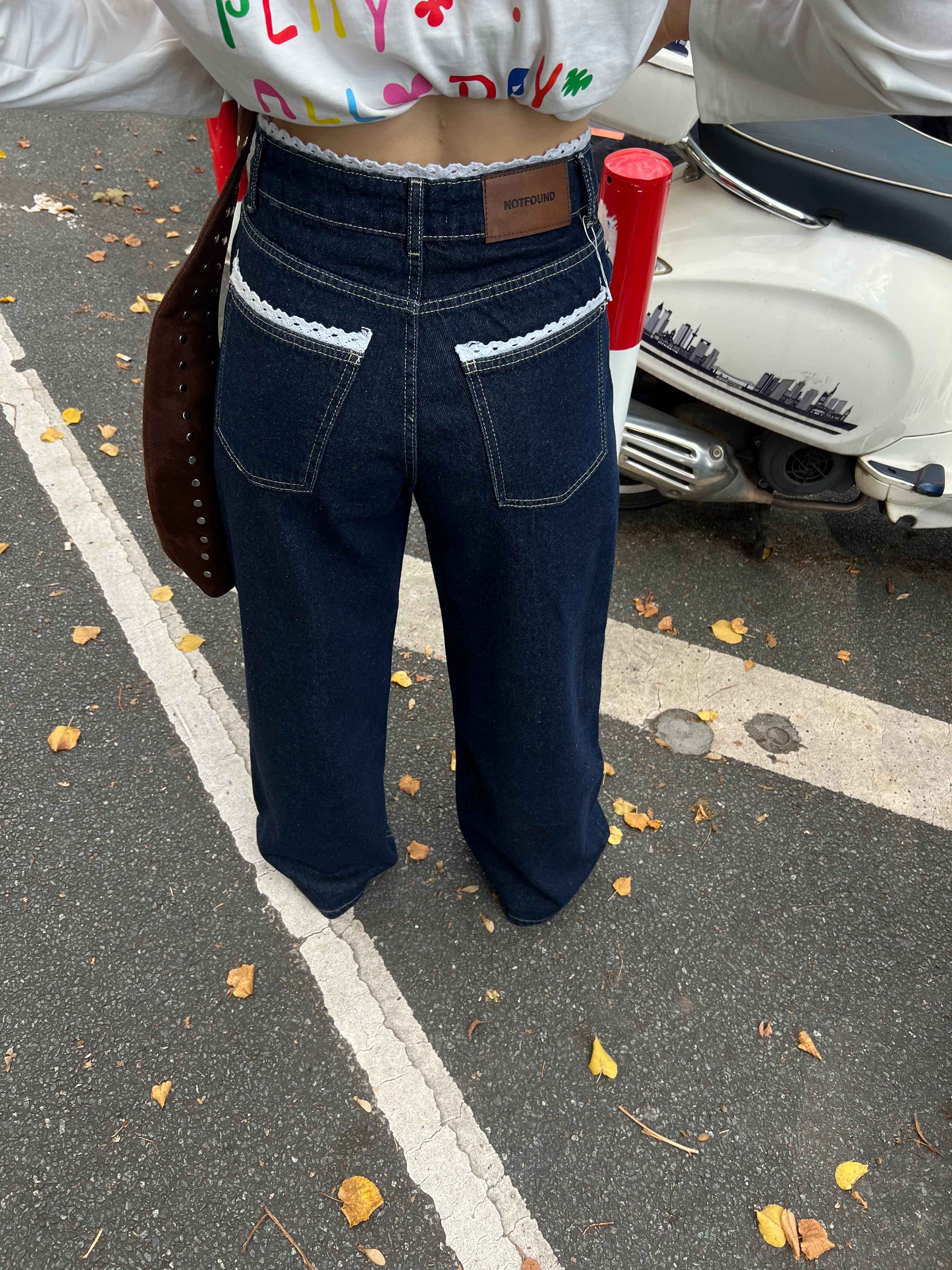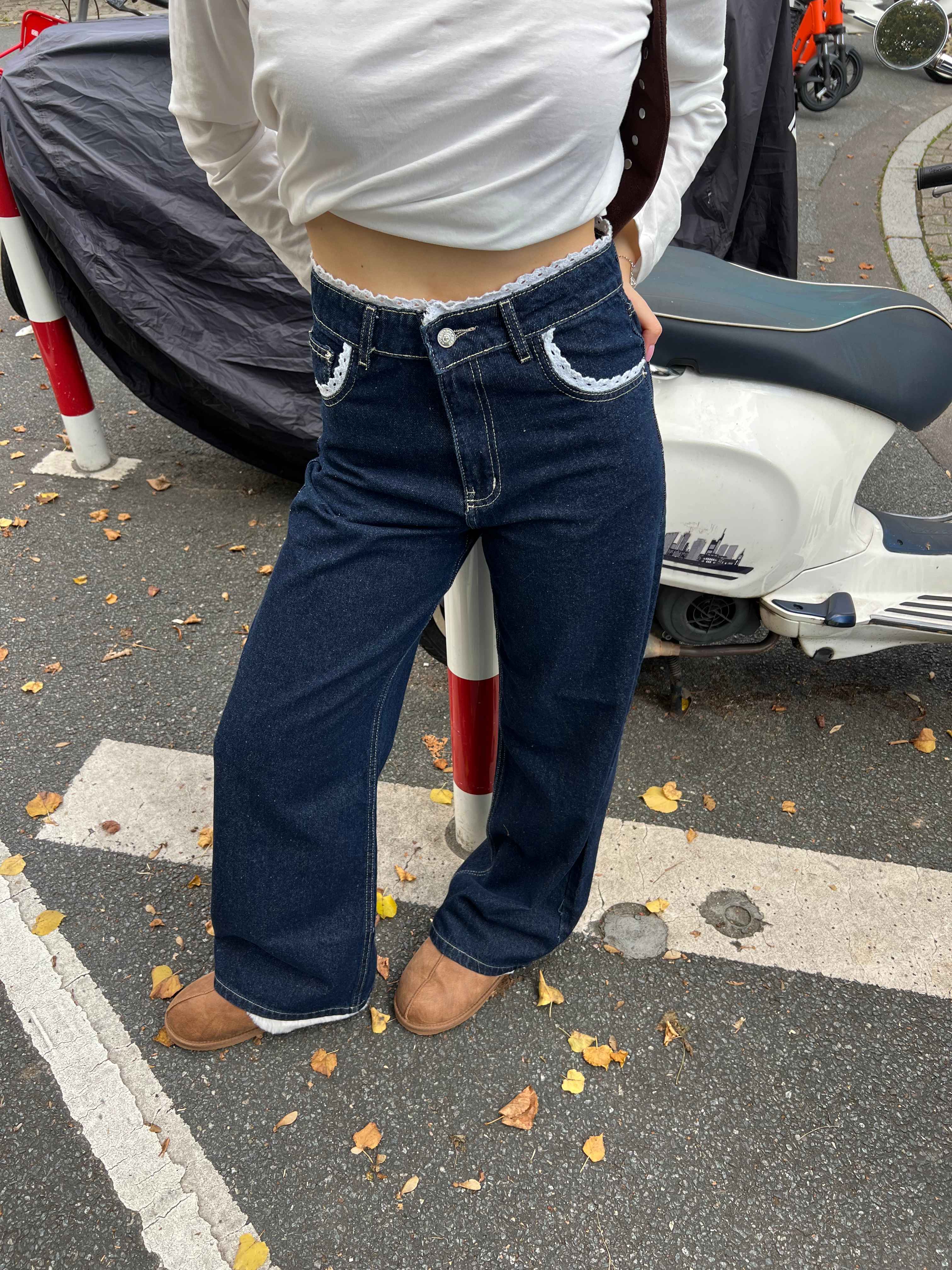 High-rise wide-leg denim pants detailed with white lace trim on all front and back pockets.
