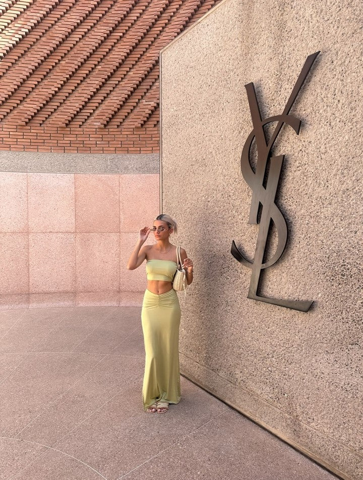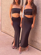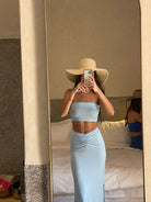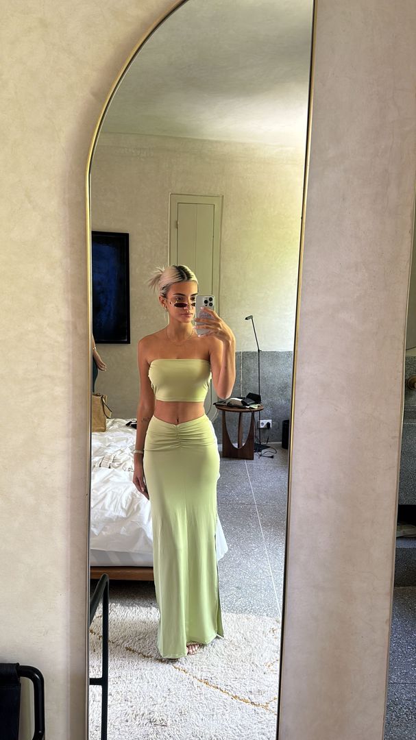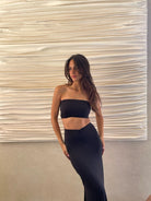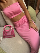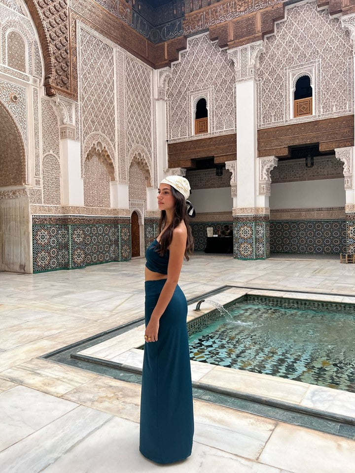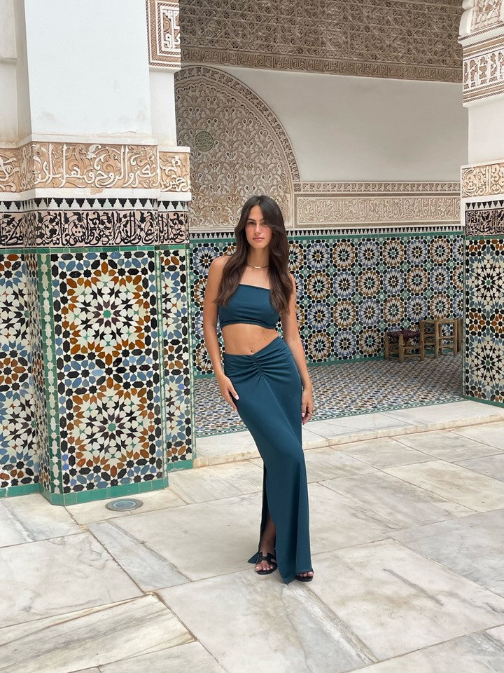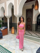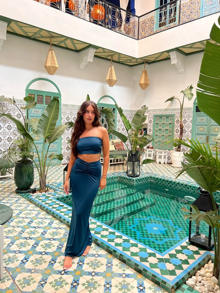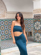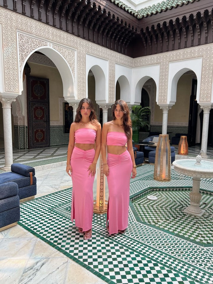 Our Maroc sets include a form - fitting skirt with a slit up to the knee on the right side and a matching tube top. The stretchy fabric gives ultimate comfort, with a snatched look. Model is wearing size XS