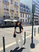 Mid waisted, wide leg denim pants. Female model is wearing size 32 and 40