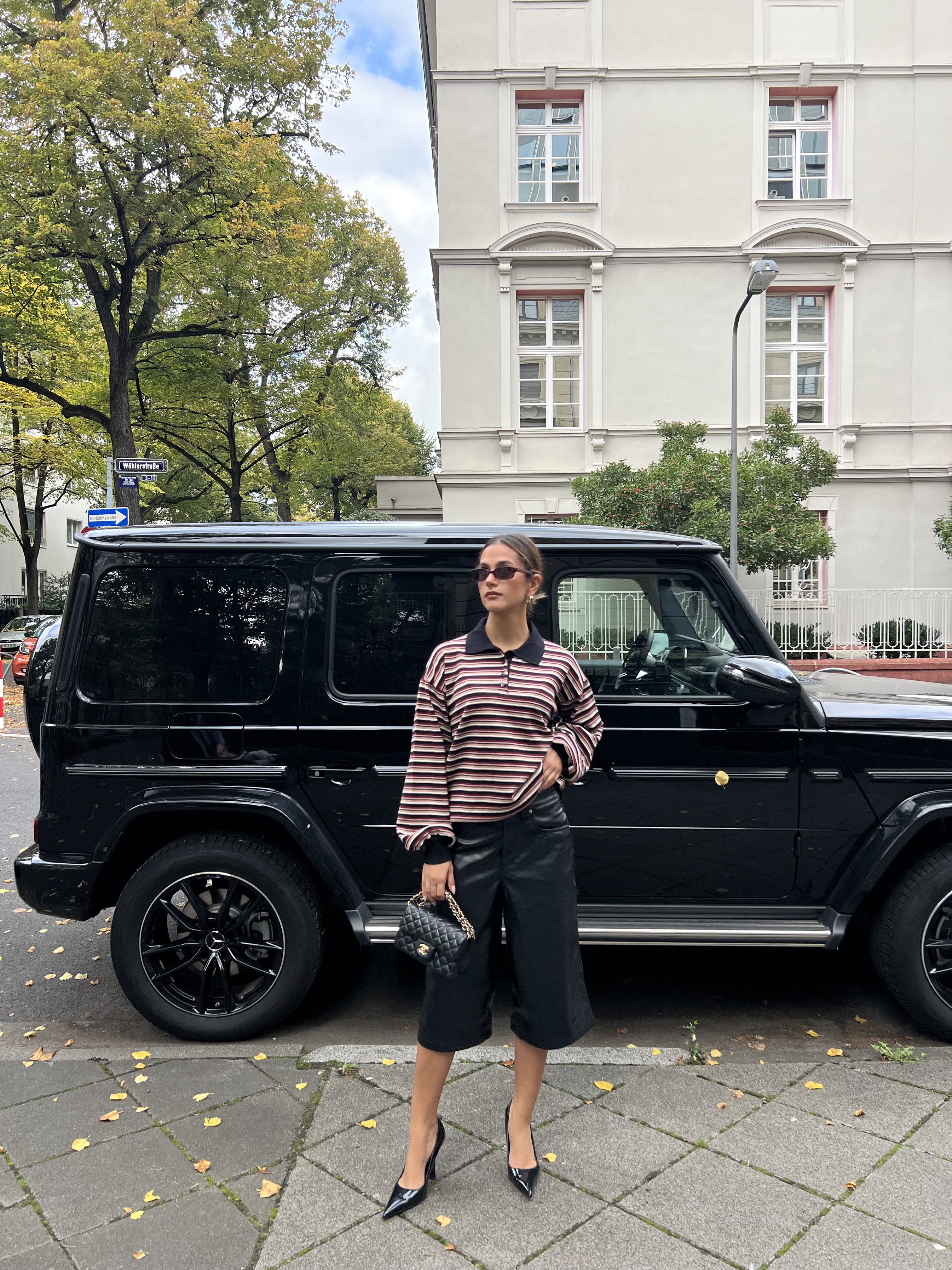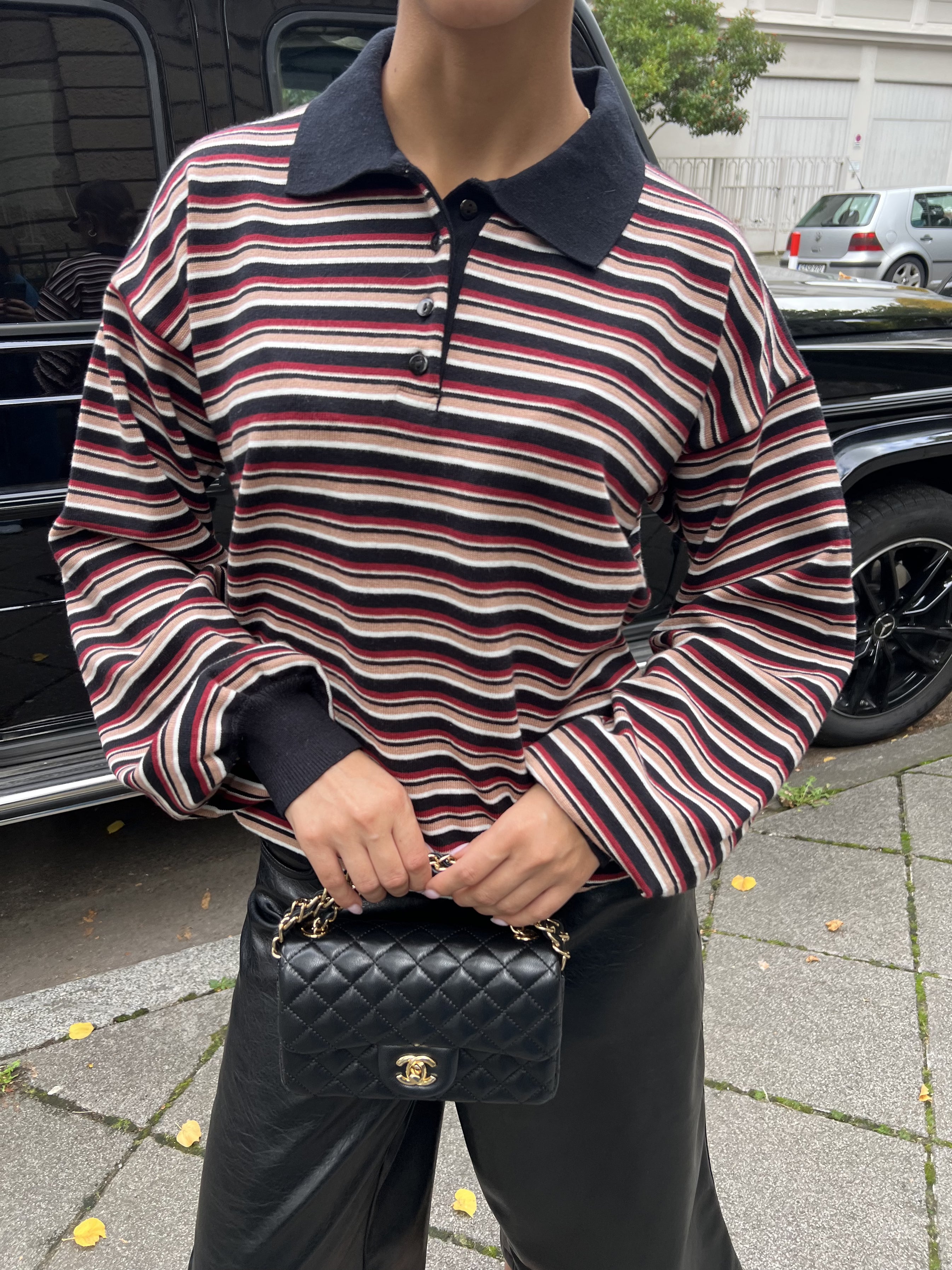 Our fall striped polo is a long-sleeve pullover with a slightly relaxed fit.