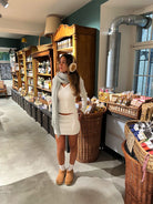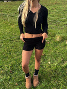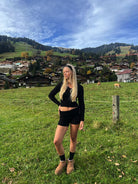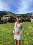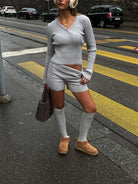 Our knit sweater is designed for a fitted fit and is true to size. It can be paired with its matching skirt or shorts for a full set look. Female model is wearing size XS/S