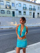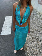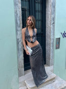 Sparkly sequin cowl-neck top. Top can be adjusted from the back. Can be bought with our matching sequin long or mini skirt for a matching set. Female Model is wearing size XS/S