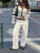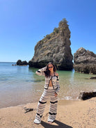 Long sleeved cardigan. Material is knit-crochet. Sold individually but can be bought along with striped out knit pants for a matching set. Female Model is wearing size M/L