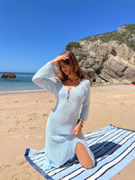 Fitted long dress with loose long sleeves. This dress DOES NOT have a slit like the picture. Material is knit-crochet. Female Model is wearing size XS/S